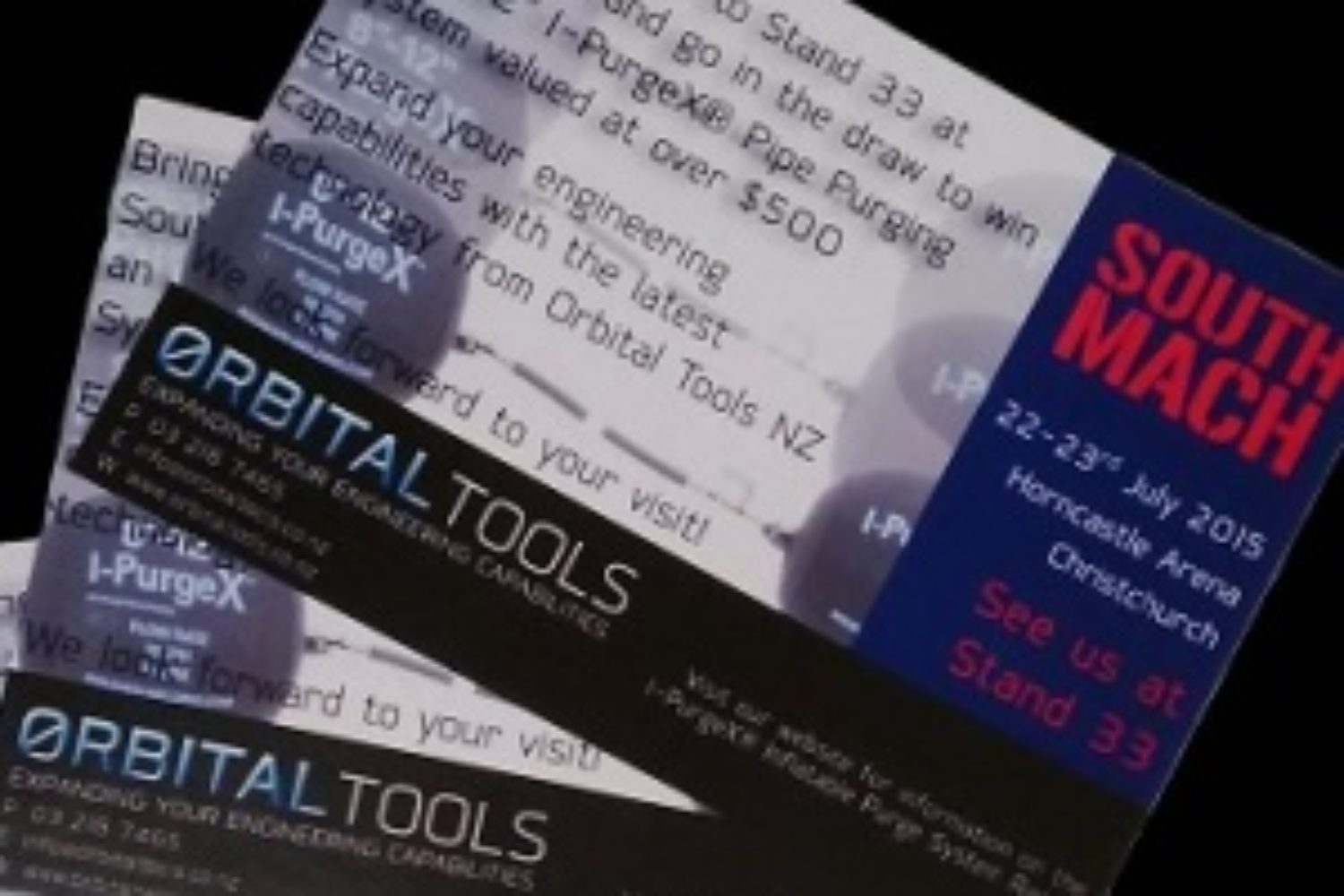 Bring your I-PurgeX Draw entry slip to Stand 33 at Southmach 2015 and go into the draw to win an I-PurgeX 8-12″ Pipe Purging System. Winner will be drawn at 4:00pm on Thursday the 23rd July. Tokens have been posted to as many of our valued clients as we had address details for. If you haven’t received your entry form yet, please email info@orbitaltools.co.nz, to confirm your attendance and inclusion in the draw.